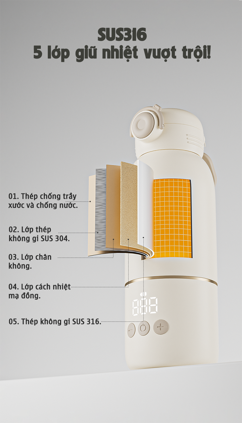 - Thân bình giữ nhiệt năm lớp có thể giữ nhiệt độ ấm trong khi hết pin.
