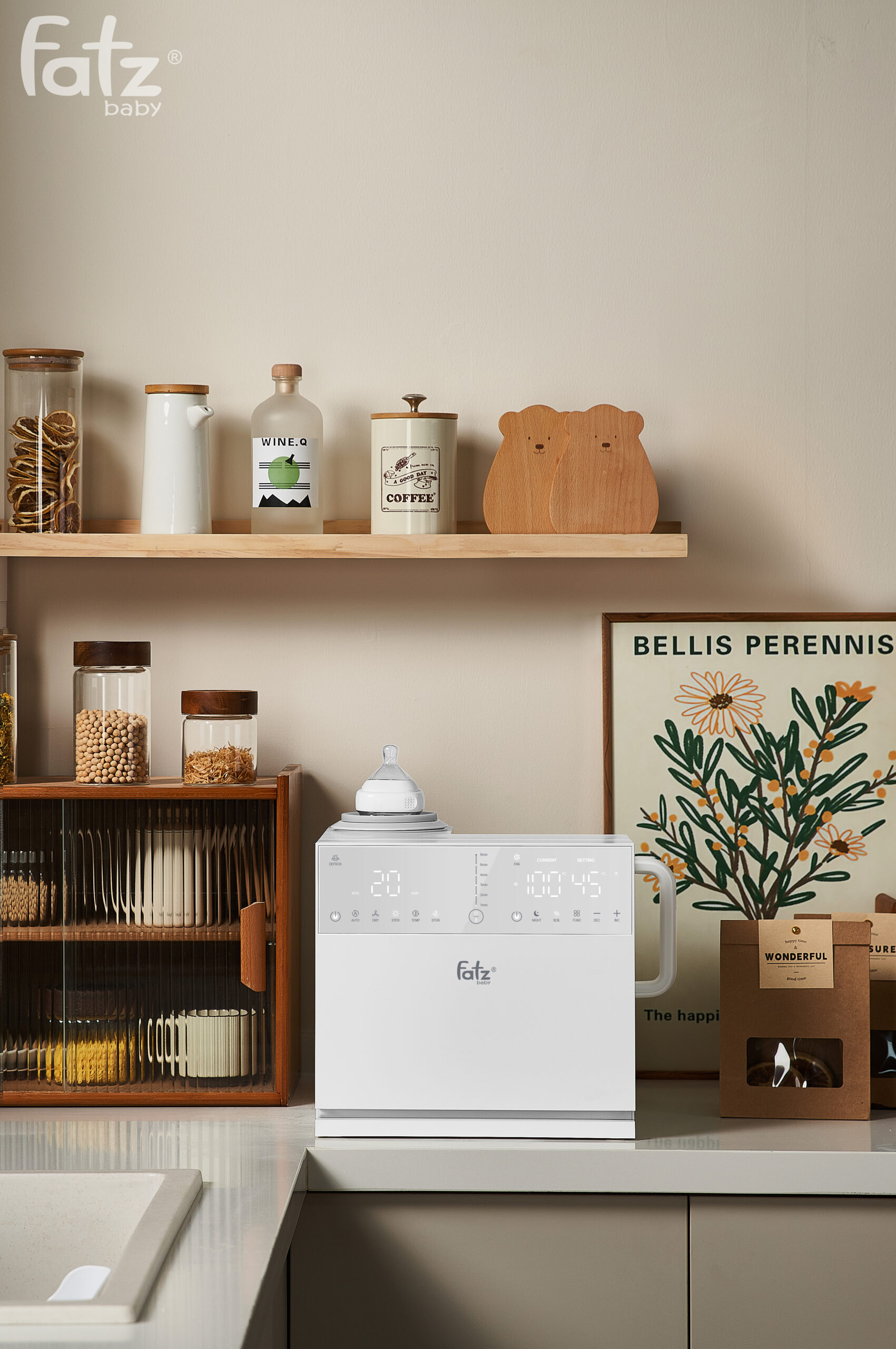 Máy thứ nhất là Máy tiệt trùng UVC tiên tiến có dung tích lớn 8.5 lít, cho phép tiệt trùng cùng lúc nhiều bình sữa và vật dụng của bé. Với 10 đèn UVC-LED công suất cao được bố trí khoa học trên cả hai bề mặt máy, mọi ngóc ngách đều được khử trùng hiệu quả, loại bỏ đến 99.9% vi khuẩn gây hại. Hai mức nhiệt độ sấy 45°C và 65°C cho phép bạn lựa chọn chế độ phù hợp với từng loại chất liệu bình sữa, đảm bảo an toàn và kéo dài tuổi thọ sản phẩm.